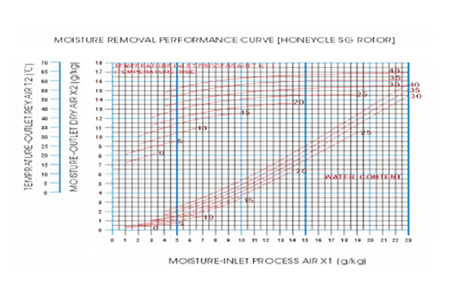 注:1、工况:27度、60%RH;2、380V/50Hz/4N,蒸汽再生型:蒸汽压力0.4MPa;3、选配控制系统(带PLC人机界面控制)。除湿性能曲线:转轮除湿机使用场合要求:设备工作环境温度0-40℃、相对湿度不超过80%RH,通风良好,维修空间宽敞。除湿干燥空间的围护结构须做好防水防潮措施,同时还应具有良好的密闭性,有温度要求的除湿干燥空间还必须作好保温措施。除湿系统运行工作时,应尽量减少除湿干燥空间的湿负荷,门窗的开合要有严格限制,防尘防灰,并遵守除湿系统对环境的其他要求。