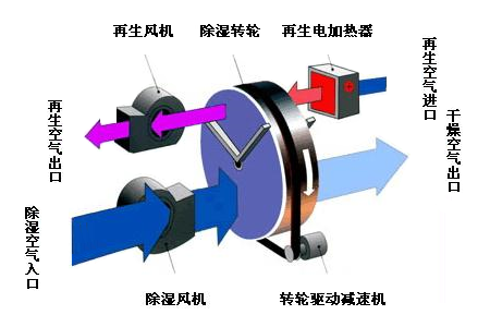 以蜂巢结构组成的圆状转盘,再由特殊结晶加工方法附着吸湿剂(氯化锂、硅胶、沸石等)原料制成除湿轮。除湿轮在机组箱体内分成除湿区和再生区,除湿转轮在分隔的除湿区与再生区的箱体内不停的运转。当其工作时,吸湿转轮缓慢转动,需要除湿的空气(处理空气) 经转轮迎风面的3/4除湿区域被吸入,通过转轮后空气中的水份被轮中吸湿材料吸收或吸附,随后经过除湿的干燥空气在风机的作用下,送至须除湿的房间或空间;与此同时,另一部分空气(再生空气)先经过空气加热器加热, 然后经转轮迎风面的1/4再生区域通过转轮,以便将转轮从处理空气中吸收的水份排走。由于转轮一直在缓慢旋转,所以吸湿和再生得以连续进行,达到稳定除湿过程。
