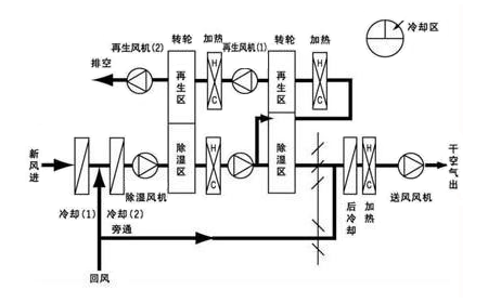 机组组成:1. 转轮段(包括干燥转轮、再生风机、再生加热器、再生过滤器和再生阀门)