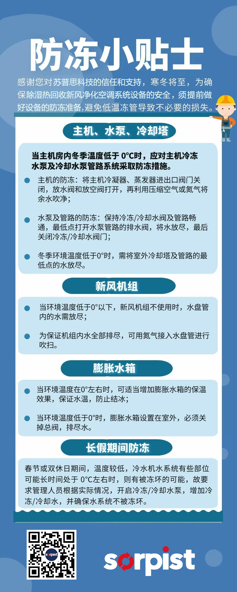 寒潮来袭,气温剧降,为确保您的除湿热回收新风净化空调设备系统的安全,须提前做好设备的防冻准备,避免低温冻管导致不必要的损失。