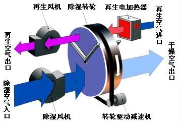 转轮除湿机的核心部件是一个蜂窝状转轮,转轮由特殊陶瓷纤维载体和活性硅胶复合而成;转轮两侧由特制的密封装置分成两个区域:处理区域及再生区域;当需要除湿的潮湿空气通过转轮的处理区域时,湿空气的水蒸汽被转轮的活性硅胶所吸附,干燥空气被处理风机送至需要处理的空间;而不断缓慢转动的转轮载着趋于饱和的水蒸汽进入再生区域;再生区内反向吹入的高温空气使得转轮中吸附的水份被脱附,被风机排出室外,从而使转轮恢复了吸湿的能力而完成再生过程;转轮不断地转动,上述的除湿及再生周而复始地进行,从而保证除湿机持续稳定的除湿状态。