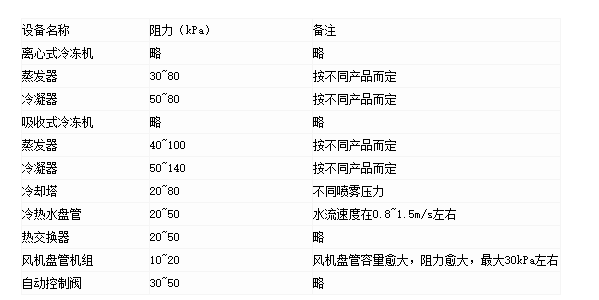 3.空调未端装置阻力:末端装置的类型有风机盘管机组,组合式空调器等。它们的阻力是根据设计提出的空气进、出空调盘管的参数、冷量、水温差等由制造厂经过盘管配置计算后提供的,许多额定工况值在产品样本上能查到。此项阻力一般在20~50kPa范围内。