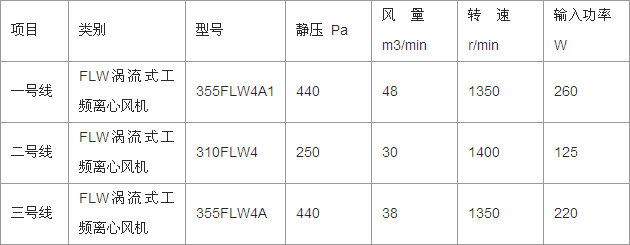 考虑到管道可能漏风等原因。一般是在系统所需风量、风压的基础上乘以一个安全系数,来确定风机的风量和风压。风压偏高、风量偏大,与实际需要相差太大。不但造成了大量的能源浪费,而且往往给运行带来很大困难。格式。由前面设计计算,本设计一号线风量取1535m3/h,选型风压取291Pa,二号线风量取1535m3/h,选型风压取60Pa,三号线风量取1575m3/h,选型风压取166Pa。