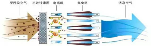 静电除尘器是靠静电力把颗粒物从空气中分离出来。除尘器分为两段,前段是电离器,通过电极间几千伏的高压电,把本来中性的空气分子电离成带电状态,然后空气中的尘埃被带电空气分子“传染”上电荷;除尘器的后段是一排集尘板,集尘板之间是高压电场,带了电荷的尘埃在电场的作用下,偏离气流轨迹而被捕获。