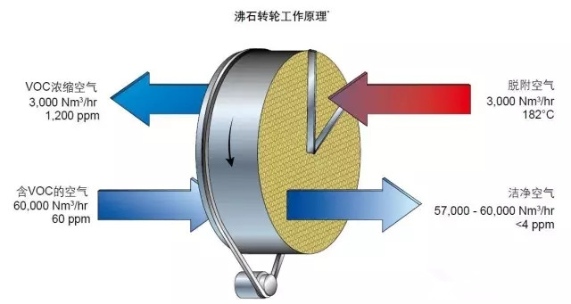 待处理(附带溶剂)空气经过沸石转轮时,气流中的VOCs被疏水沸石吸附。随后洁净的空气通过转轮排放到大气中。
