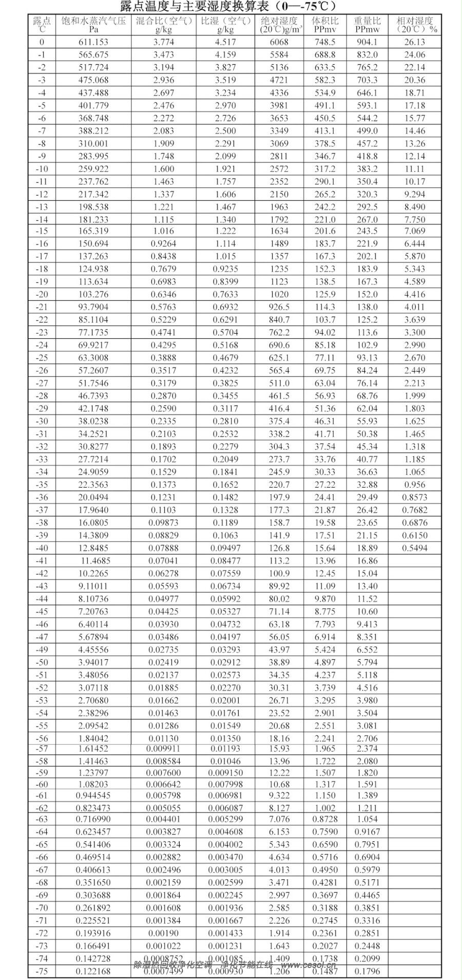 露点温度与主要湿度换算表