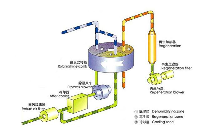 配置的低露点转轮除湿机的核心吸附除湿转轮,具有高效吸湿性能,可以处理100%湿空气并且不脱落,不变形。使用寿命特长,可多次清洗。转轮分为吸湿区、再除区和再生区。空气中的水分在吸湿区被吸附在转轮后,将干燥后的空气连续不断地送出。同时吸收了水分的转轮转动到再生区,从逆方向送入的再生空气完全去除吸附在转轮上水分,经过特殊组配露点可达-80℃以下,充分实现苛刻除湿要求场合的应用可行,广泛应用在锂电池生产、塑胶粒子干燥、军工武器试验等特殊的超低露点的除湿干燥应用场所。