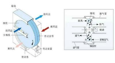 由电机驱动作旋转运动的热交换转轮,由于采用了蜂窝状结构设计,其体积虽小,却有着吸湿、蓄热的巨大接触面积和良好传热性能,是一个巨大的蓄热体,具备回收显热和潜热的优异特性。热交换转轮上半部通过室外新风,下半部通过室内排风。在寒冷的冬季,室内排风的温湿度均高于室外新风,排风通过热交换转轮时,会使热交换转轮的温度升高,水分含量增加,当转轮经过清洁隔离区转至新风区时,向室外新风释放热量与水分,使新风升温、增湿。夏季正好相反,降低新风温湿度,增高排风温湿度。